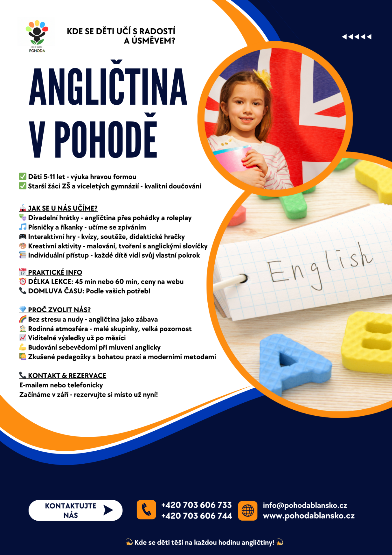 Máte doma malé děti a zvažujete, že byste jim zajistili první kontakt s angličtinou? Klíčem k úspěšnému naučení cizího jazyka je přirozený a hravý přístup, což my v POHODĚ dobře víme. Naše kroužky angličtiny pro děti od 4 let jsou navrženy tak, aby byly nejen efektivní, ale především zábavné a motivující.